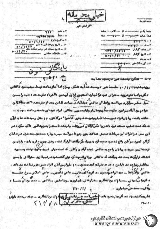 روز پنجشنبه 27 /1 /50 جلسه مذهبی در مسجد هدایت تشکیل و پس از ادای نماز جماعت توسط سید محمود طالقانی دکتر جواد باهنر شروع به سخنرانی نمود و اظهار داشت چون از اول اربعین تا آخر ماه صفر به مدت ده شب در این محل سوگواری برپاست و واعظ آن صالحی نجف آبادی1 میباشد لذا من بعد از صفر مجدد خدمت آقایان خواهم بود آنگاه پیرامون حکومت معاویه و عمال او و قیام حسینی مطالبی ایراد نمود این جلسه در ساعت 2030 خاتمه یافت در پایان ضمن بحث اظهار مینمودند دو نفری که اخیراً در کلانتری 13 به قتل رسیدهاند شاید از آن عده که تحت تعقیب هستند نبودهاند زیرا عکس از آنان در روزنامه چاپ نشده است در این موقع شالچی تأکید مینمود در این محل در اطراف این جریانات صحبتی ننمایید چون وضع ناجور است سپس درباره جستجوی چند منزل در خیابان گرگان که مورد سوء ظن واقع شده بود صحبت گردید و به یکدیگر میگفتند اگر از گذشته در منزل چیزی دارید باید در اولین فرصت از بین ببرید و در پایان راجع به صالحی نجف آبادی و کتابی که تحت عنوان شهید جاوید2 نوشته و مورد انتقاد قرار گرفته بحث شد و میگفتند که طالقانی چرا او را دعوت کرد ولی گفته میشود در شبها از وی سؤالاتی راجع به کتابش خواهد شد تا پاسخ دهد. عده شرکتکنندگان حدود 160 نفر و از بین آنها افراد مشروحه به شرح زیر شناخته شدهاند.