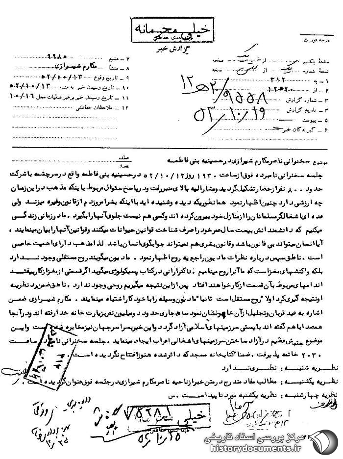 جلسه سخنرانی نامبرده فوق از ساعت 1930 روز 13 /10 /52 در حسینیه بنیفاطمه واقع در سرچشمه با شرکت حدود 800 نفر از حضار تشکیل گردید و مشارالیه بالای منبر رفت و در پاسخ به سؤال مربوط به این که مذهب در این زمان چه ارزشی دارد، چنین اظهار نمود. همانطوری که دیده و شنیدهاید با اینکه بشر امروز دم از قانون و غیره میزند ولی عدهای اشغالگر مسلمانان را از منزل خود بیرون کردهاند و کسی هم نیست جلوی آنها را بگیرد. ما در زمانی زندگی میکنیم که دانشمندانش بیست سال عمر خود را صرف شناخت قوانین حیوانات میکنند و قوانین آنها را بیان مینمایند، آیا انسان میتواند بیقانون باشد و قانون بشری هم نمیتواند جوابگوی انسان باشد؛ لذا مذهب دارای اهمیت خاصی است. ناطق سپس درباره نظرات مادیون راجع به روح اظهار نمود، مادیون میگویند روح مستقلی وجود ندارد بلکه واکنشهای مغز است که ما آن را روح مینامیم. دکتر ارانی در کتاب پسیکولوژی1 میگوید اگر قسمتی از مغز از کار بیفتد اندامهای مربوط به آن قسمت از کار خواهند افتاد پس از این نتیجه میگیریم روحی وجود ندارد. ناطق ضمن رد نظریه او نتیجهگیری کرد اولاً روح مستقل است. ثانیاً مادیون وسیله را با خود کار اشتباه مینمایند. مکارم شیرازی ضمن اشاره به عید قربان و تجلیل از آن خاطرنشان نمود سال جاری حدود دو میلیون نفر به زیارت خانه خدا رفتهاند و در آنجا همصدا با هم گفتهاند بایستی سرزمینهای اسلامی آزاد گردد و این خبر به سراسر جهان نیز مخابره شده است و این موضوع جنبش عظیم در آزاد ساختن سرزمینهای اشغالی اعراب ایجاد مینماید. جلسه سخنرانی نامبرده ساعت 2030 خاتمه پذیرفت. ضمناً کتابخانه مسجد که دایر شده هنوز افتتاح نگردیده است.2