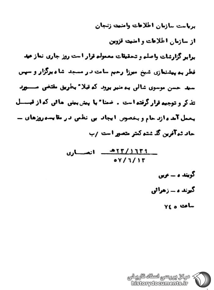 برابر گزارشات واصله و تحقیقات معموله قرار است روز جاری نماز عید فطر به پیشنمازی شیخ میرزا رحیم سامت در مسجد شاه برگزار و سپس سیدحسن موسوی شالی به منبر برود که قبلاً به طریق مقتضی مورد تذکر و توجیه قرار گرفته است1 ضمناً با پیشبینیهایی که از قبل به عمل آمده ازدحام و به خصوص ایجاد بینظمی در مقایسه روزهای حادثهآفرین گذشته کمتر متصور است.