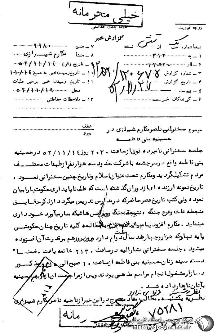 جلسه سخنرانی نامبرده فوق از ساعت 2030 روز 14 /11 /52 در حسینیه بنیفاطمه واقع در سرچشمه با شرکت حدود سه هزار نفر از طبقات مختلف مردم تشکیل گردید و مکارم تحت عنوان اسلام و تاریخ چنین سخنرانی نمود.