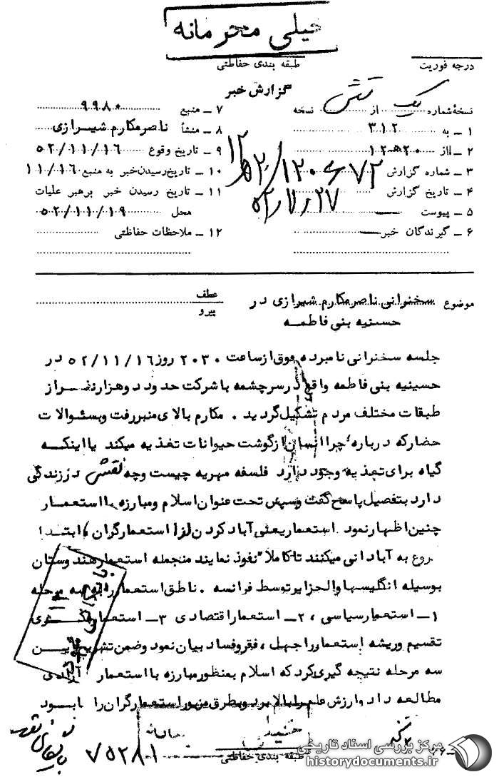 جلسه سخنرانی نامبرده فوق از ساعت 2030 روز 16 /11 /52 در حسینیه بنیفاطمه واقع در سرچشمه با شرکت حدود دو هزار نفر از طبقات مختلف مردم تشکیل گردید. مکارم بالای منبر رفت و به سؤالات حضار که درباره چرا انسان از گوشت حیوانات تغذیه میکند با اینکه گیاه برای تغذیه وجود دارد. فلسفه مهریه چیست و چه نقشی در زندگی دارد، به تفصیل پاسخ گفت و سپس تحت عنوان اسلام و مبارزه با استعمار چنین اظهار نمود. استعمار یعنی آباد کردن، لذا استعمارگران، ابتدا شروع به آبادانی میکنند تا کاملاً نفوذ نمایند منجمله استعمار هندوستان به وسیله انگلیسها و الجزایر توسط فرانسه. ناطق استعمار را به سه مرحله 1. استعمار سیاسی. 2. استعمار اقتصادی. 3. استعمار فکری تقسیم و ریشه استعمار را جهل، فقر و فساد بیان نمود و ضمن تشریح این سه مرحله، نتیجهگیری کرد که اسلام به منظور مبارزه با استعمار، آزادی مطالعه داد و ارزش علم را بالا برد و به طرق مزبور استعمارگران را نابود نمود. جلسه سخنرانی مکارم در ساعت 2130 خاتمه یافت.