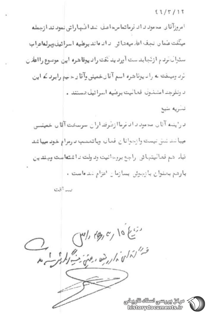 امروز آقای محمود دادفرما تماس حاصل شد اظهاراتی نمودند از جمله میگفت علمای نجف اعلامیههایی دادهاند بر علیه اسرائیل و بر له اعراب سؤال کردم از کجا به دست آوردید گفت رادیو قاهره این موضوع را اعلان کرد و میگفت به رادیو قاهره اسم آقای خمینی و آقای حکیم را برد که این دو نفر جدا مشغول فعالیت بر علیه اسرائیل هستند.