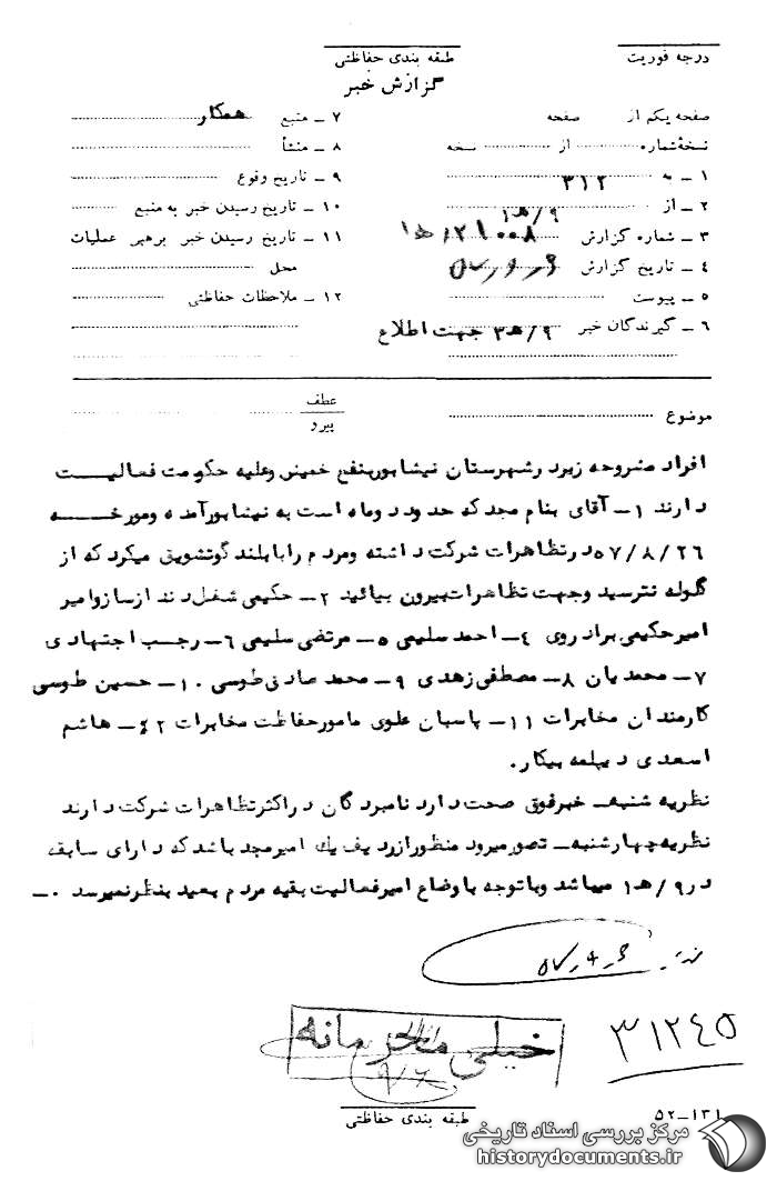 1. آقائی به نام مجد که حدود دو ماه است به نیشابور آمده و مورخه 26 /8 /57 در تظاهرات شرکت داشته و مردم را با بلندگو تشویق میکرد که از گلوله نترسید و جهت تظاهرات بیرون بیائید.