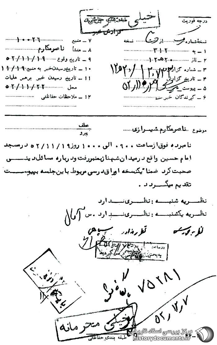 نامبرده فوق از ساعت 0900 الی 1000 روز 19 /11 /52 در مسجد امام حسین واقع در میدان شهناز به منبر رفت و درباره مسائل دینی صحبت کرد. ضمناً یک نسخه اوراق درسی مربوط به این جلسه به پیوست1 تقدیم میگردد.