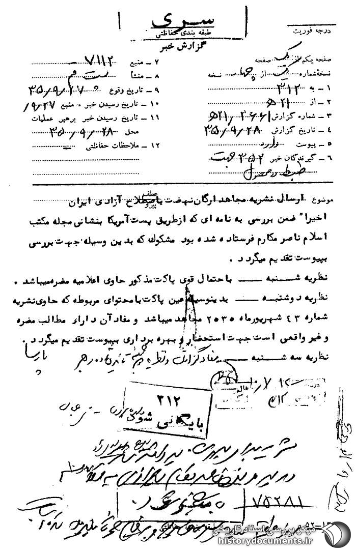 نشریه برای بهرهبرداری برداشته شد. در پرونده ناصر مکارم شیرازی به کلاسه 75281 بایگانی شود. از طبقهبندی سری خارج و به خیلی محرمانه تبدیل شده است.