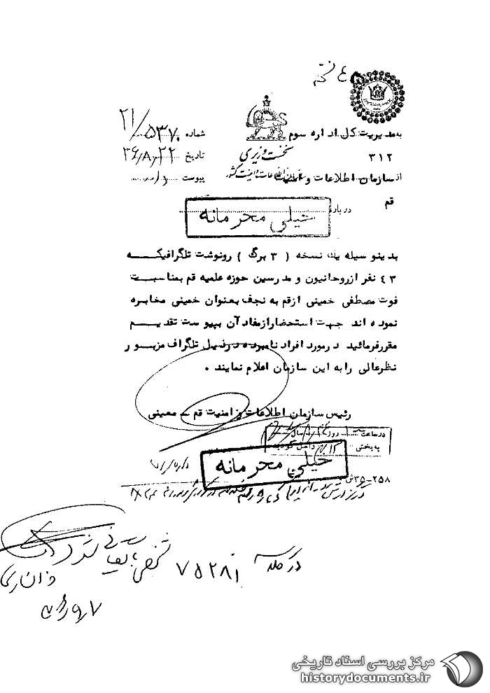 بدینوسیله یک نسخه (سه برگ) رونوشت تلگرافی که 43 نفر از روحانیون و مدرسین حوزه علمیه قم به مناسبت فوت مصطفی خمینی از قم به نجف به عنوان خمینی مخابره نمودهاند جهت استحضار از مفاد آن به پیوست1 تقدیم، مقرر فرمایید در مورد افراد نامبرده در ذیل تلگراف مزبور نظر عالی را به این سازمان اعلام نمایند.