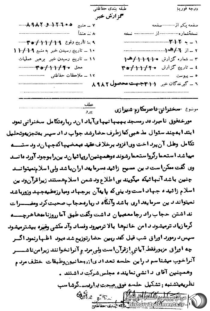 مورخه فوق [19 /11 /35] نامبرده در مسجد بهبهانیهای آبادان درباره تکامل سخنرانی نمود. ابتدا به چند سؤال مذهبی که از طرف حضار شد، جواب داد. سپس به تجزیه و تحلیل تکامل و علل آن پرداخت وی افزود برخلاف عقیده بعضیها که جهان دو دسته میباشد، استعمارگر و استعمارشونده و همچنین اروپاییان دین را به وجود آوردهاند. وی گفت ممکن است دین مسیح زاییده سرمایهداران باشد ولی اسلام نمیتواند چنین باشد. آنهایی که میگویند بیاطلاع و دشمن اسلام هستند زیرا قرآن و دین اسلام زاییده جهاد است و دینی که پایه آن بر جهاد و مبارزه علیه جهل1 و زور باشد نمیتواند دین سرمایهداری باشد و آنگاه درباره حجاب صحبت کرد و مضرات نداشتن حجاب را در جامعه بیان داشت و گفت طبق آمار روزنامهها هرچه گرما زیادتر میشود دامن خانمها بالاتر میرود و فساد و آدمکشی و غیره بیشتر میشود. سپس در مورد اوراق شب قبل که در بین حضار توزیع شده بود اظهار نمود اگرچه اوراق مزبور فقط آیاتی از قرآن است ولی مردم آن را نخوانند زیرا من ناشر آن را خوب میشناسم. در این جلسه تعدادی از روحانیون و طبقات مختلف مردم و همچنین آقای دانشی نماینده مجلس شرکت داشتند.