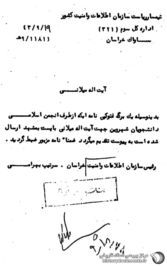 به : ساواک خراسان شماره : 11778 /9 ه