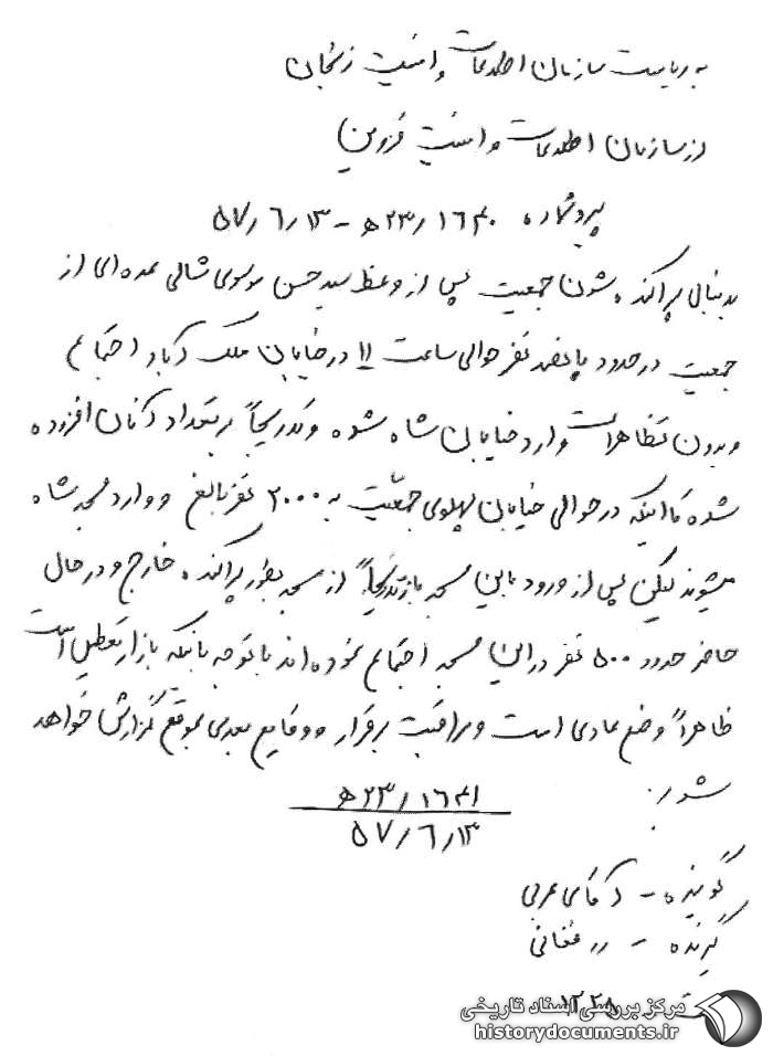 به دنبال پراکنده شدن جمعیت پس از وعظ سیدحسن موسوی شالی عدهای از جمعیت در حدود پانصد نفر حوالی ساعت 11 در خیابان ملکآباد اجتماع و بدون تظاهرات وارد خیابان شاه شده و تدریجاً بر تعداد آنها افزوده شده تا اینکه در حوالی خیابان پهلوی جمعیّت به 2000 نفر بالغ و وارد مسجد شاه میشوند لیکن پس از ورود به این مسجد باز تدریجاً از مسجد بهطور پراکنده خارج و در حال حاضر حدود 500 نفر در این مسجد اجتماع نمودهاند باتوجه به اینکه بازار تعطیل است ظاهراً وضع عادی است و مراقبت برقرار و وقایع بعدی به موقع گزارش خواهد شد.1