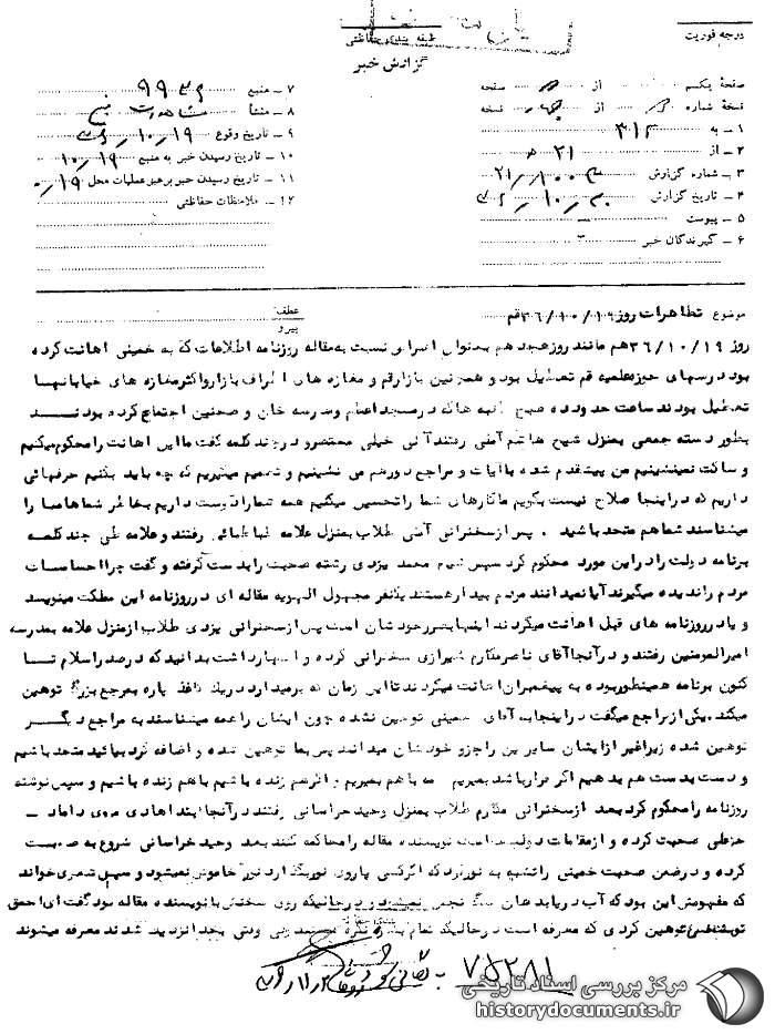 روز 19 /10 /36 هم مانند روز هجدهم به عنوان اعتراض نسبت به مقاله روزنامه اطلاعات که به خمینی اهانت کرده بود درسهای حوزه علمیه قم تعطیل بود و همچنین بازار قم و مغازههای اطراف بازار و اکثر مغازهها و خیابانها تعطیل بودند. ساعت حدود 10 صبح طلبهها که در مسجد اعظم و مدرسه خان و صحنین اجتماع کرده بودند به طور دستهجمعی به منزله شیخ هاشم آملی رفتند. آملی خیلی مختصر و در چند کلمه گفت ما این اهانت را محکوم میکنیم و ساکت نمینشینیم. من پیشقدم شده با آیات و مراجع دور هم مینشینیم و تصمیم میگیریم که چه باید بکنیم حرفهایی داریم که در اینجا صلاح نیست بگویم. ما کارهای شما را تحسین میکنیم. همه شما را دوست داریم به خاطر شماها ما را میشناسند شما هم متحد باشید. پس از سخنرانی آملی طلاب به منزل علامه طباطبائی رفتند و علامه طی چند کلمه برنامه دولت را در این مورد محکوم کرد. سپس شیخ محمد یزدی1 رشته صحبت را به دست گرفته و گفت چرا احساسات مردم را ندیده میگیرند آیا نمیدانند مردم بیدار هستند یک نفر مجهولالهویه مقالهای در روزنامه این مملکت مینویسد و یا در روزنامههای عربی اهانت میکردند اینها به ضرر خودشان است. پس از سخنرانی یزدی طلاب از منزل علامه به مدرسه امیرالمومنین رفتند و در آنجا آقای ناصر مکارم شیرازی سخنرانی کرده و اظهار داشت بدانید که از2 صدر اسلام تاکنون برنامه همینطور بوده به پیغمبران اهانت میکردند تا این زمان که برمیدارد در یک کاغذ پاره به مرجع بزرگ توهین میکند. یکی از مراجع میگفت در اینجا به آقای خمینی توهین نشده چون ایشان را همه میشناسند به مراجع دیگر توهین شده زیرا غیر از ایشان سایرین را جزو خودشان میدانند پس به ما توهین شده و اضافه کرد بیایید متحد باشیم و دست به دست هم بدهیم اگر قرار باشد بمیریم همه با هم بمیریم و اگر هم زنده باشیم با هم زنده باشیم و سپس نوشته روزنامه را محکوم کرد. بعد از سخنرانی مکارم طلاب به منزل وحید خراسانی رفتند در آنجا ابتدا هادی مروی داماد خزعلی صحبت کرده و از مقامات دولت خواست نویسنده مقاله را محاکمه کنند. بعد وحید خراسانی شروع به صحبت کرده و در ضمن صحبت خمینی را تشبیه به نور کرد که اگر کسی پا روی نور بگذارد نور خاموش نمیشود و سپس شعری خواند که مفهومش این بود که آب دریا به دهان سگ نجس نمیشود و در حالی که روی سخنش با نویسنده مقاله بود گفت ای احمق تو به شخصی توهین کردی که معرفه است در حالی که تمام ... نکره هستند ولی وقتی به خدا نزدیک شدند معرفه میشوند.