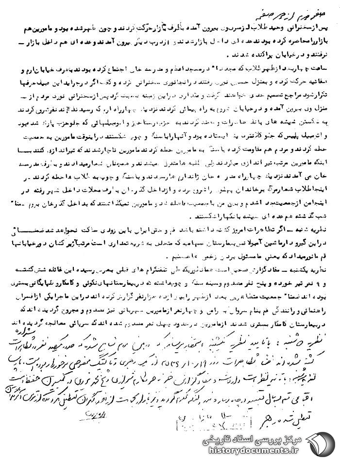 نظریه یکشنبه. مفاد گزارش صحیح است. همانطوری که طی تلفنگرامهای قبلی به عرض رسیده این غائله شش کشته و 9 نفر تیرخورده و پنج نفر مصدوم وسیله سنگ و چوب داشته که در بیمارستانهای نکویی4 و کامکار5 و گلپایگانی6 بستری بودهاند. ضمناً جمعیت متظاهرین بعدازظهر را بیش از ده هزار نفر گزارش کردهاند در این ماجرا یکی از افسران راهنمایی و رانندگی قم به نام سروان بهرامی و چهار نفر از مأمورین شهربانی نیز مصدوم و مجروح گردیدهاند که در بیمارستان کامکار بستری شدند. از مأمورین در حدود چهل نفر مصدوم شدهاند که سرپایی معالجه گردیدند. شراره