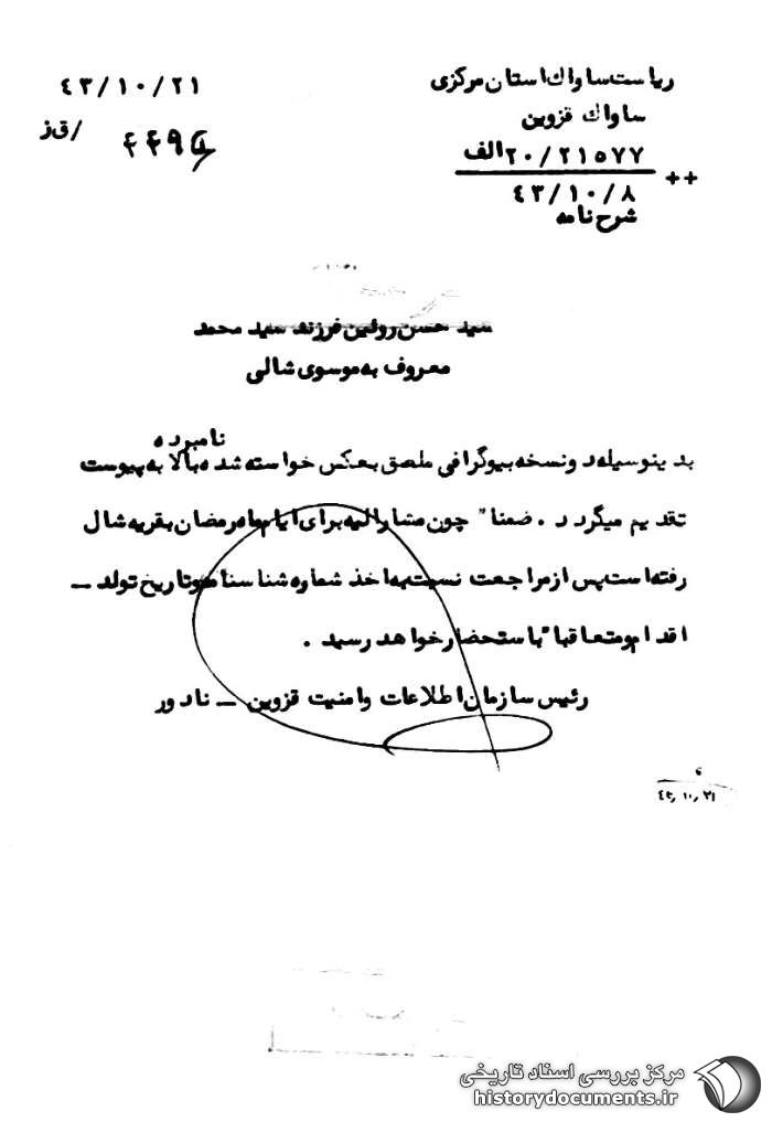 بدینوسیله دو نسخه بیوگرافی ملصق به عکس خواسته شده نامبرده بالا به پیوست تقدیم میگردد. ضمناً چون مشارالیه برای ایام ماه رمضان به قریه شال رفته است پس از مراجعت نسبت به اخذ شماره شناسنامه و تاریخ تولد او اقدام و متعاقباً به استحضار خواهد رسید.