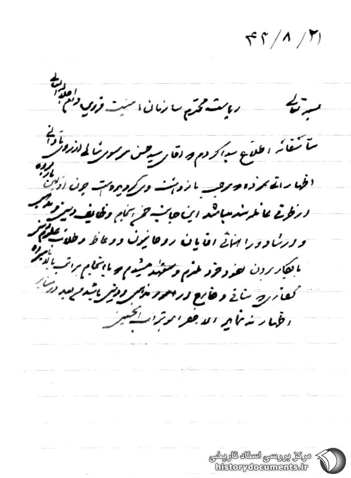 متاسفانه اطلاع پیدا کردم که آقای سیدحسن موسوی از روی نادانی اظهاراتی نموده است که موجب بازداشت وی گردیده است چون برای اولین بار بوده و از طرفی عائلهمند میباشد اینجانب ضمن انجام وظایف دینی و مذهبی و ارشاد و راهنمایی آقایان روحانیون و وعاظ و طلاب علوم دینی با به کار بردن نفوذ خود ملزم و متعهد میشوم که با انجام مراتب بالا نامبرده گفتاری که منافی و خارج از امور مذهبی و دینی باشد من بعد در منابر اظهاری ننماید.