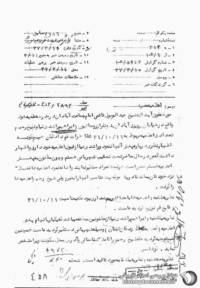 مورخه فوق آیتاله شیخ عبدالرسول قائمی امام جماعت آبادان در مدرسه علمیه خود واقع در خیابان پرویزی آبادان به دو نفر از روحانیون ابراهیم راشدینیا و شیخ رحیم تعدادی اعلامیه مربوط به 19 /10 /36 تظاهرات قم داد لکن هیچگونه اظهارنظری درباره پخش آنها ننمود و راشدینیا از قبول اعلامیه خودداری و اظهار داشت که من در حال حاضر تحت تعقیب شهربانی هستم و چون مظنون به پخش اعلامیه هستم ممکن است هر لحظه مرا دستگیر نمایند و اضافه نمود اعلامیهها فعلاً نزد خودتان بماند تا در یک موقعیت مناسب آنها را بگیریم ولی شیخ رحیم اعلامیهها را گرفت.