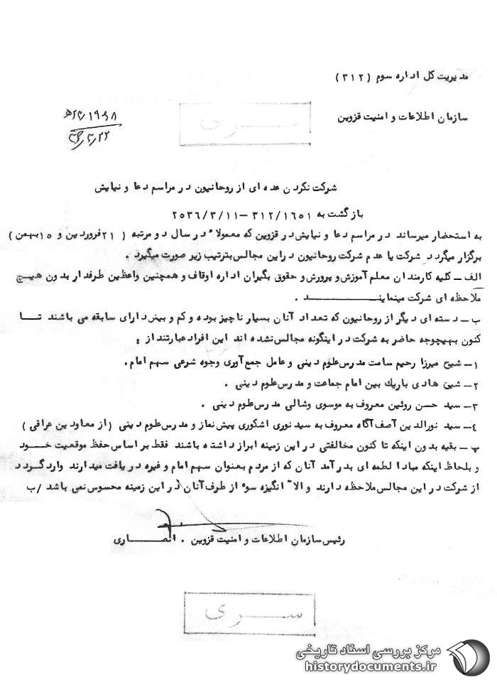 به استحضار میرساند در مراسم دعا و نیایش در قزوین که معمولاً در سال دو مرتبه (21 فروردین و 15 بهمن)1 برگزار میگردد شرکت یا عدم شرکت روحانیون در این مجالس به ترتیب زیر صورت میگیرد.