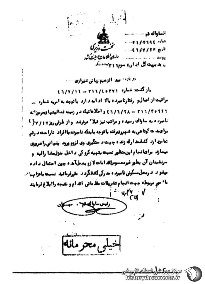 به ساواک رسیده و مراتب نیز قبلاً عرض شد و از طرفی روز 17 /7 /46 برای