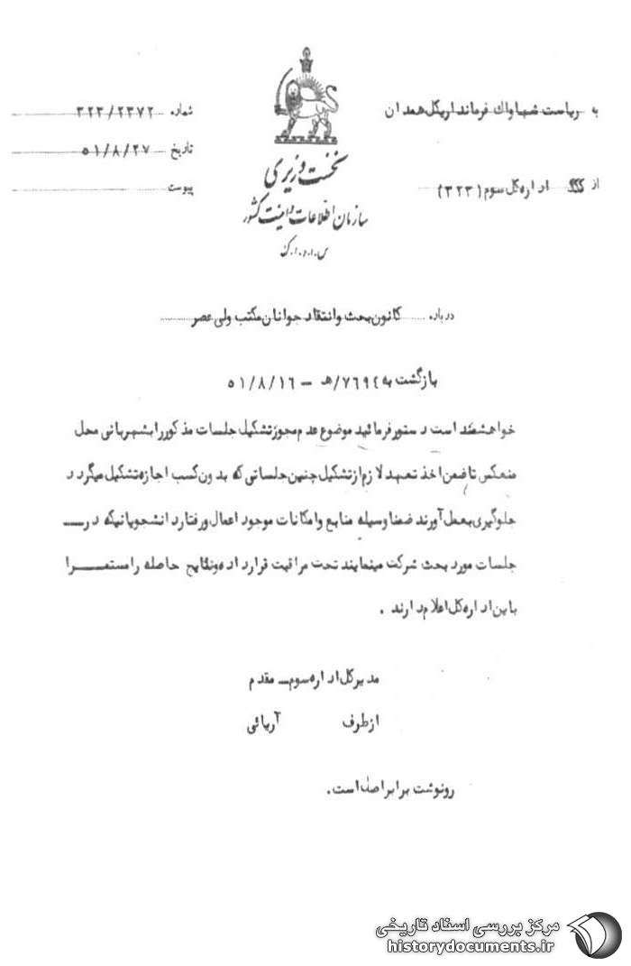 خواهشمند است دستور فرمایید موضوع عدم مجوز تشکیل جلسات مذکور را به شهربانی محل منعکس تا ضمن اخذ تعهد لازم از تشکیل چنین جلساتی که بدون کسب اجازه تشکیل میگردد جلوگیری به عمل آورند ضمناً وسیله منابع و امکانات موجود اعمال و رفتار دانشجویانی که در جلسات مورد بحث شرکت مینمایند تحت مراقبت قرار داده و نتایج حاصله را مستمراً به این اداره کل اعلام دارند.