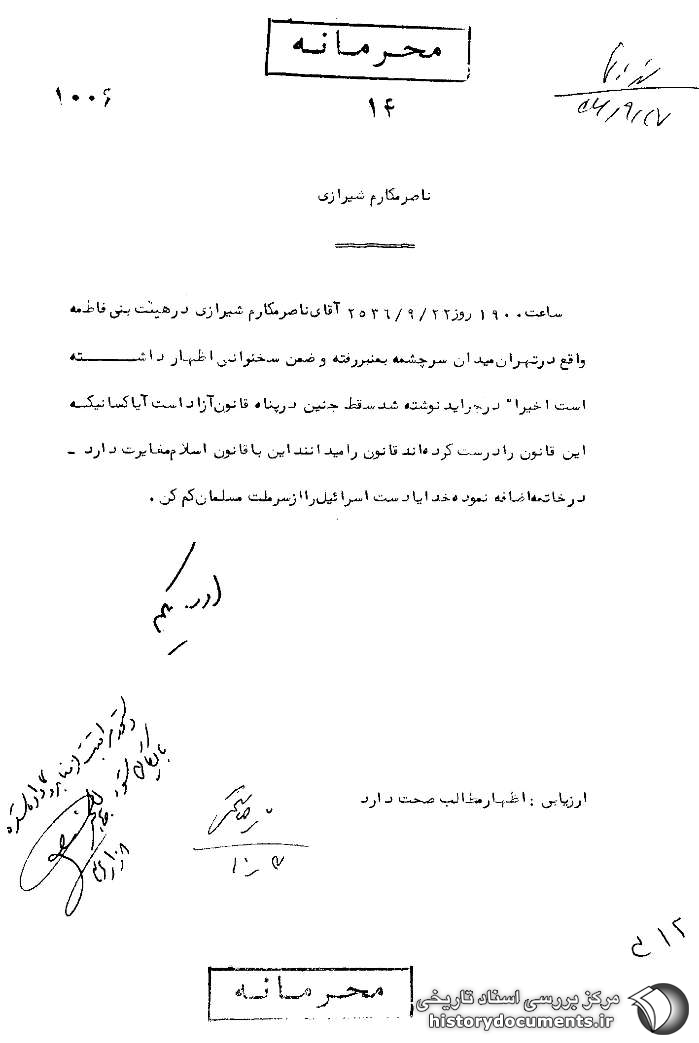 ساعت 1900 روز 22 /9 /2536 آقای ناصر مکارم شیرازی در هیئت بنیفاطمه واقع در تهران میدان سرچشمه به منبر رفته و ضمن سخنرانی اظهار داشته است اخیراً در جراید نوشته شد سقط جنین در پناه قانون آزاد است. آیا کسانی که این قانون را درست کردهاند، قانون را میدانند. این با قانون اسلام مغایرت دارد. در خاتمه اضافه نموده خدایا دست اسرائیل را از سر ملت مسلمان کم کند.