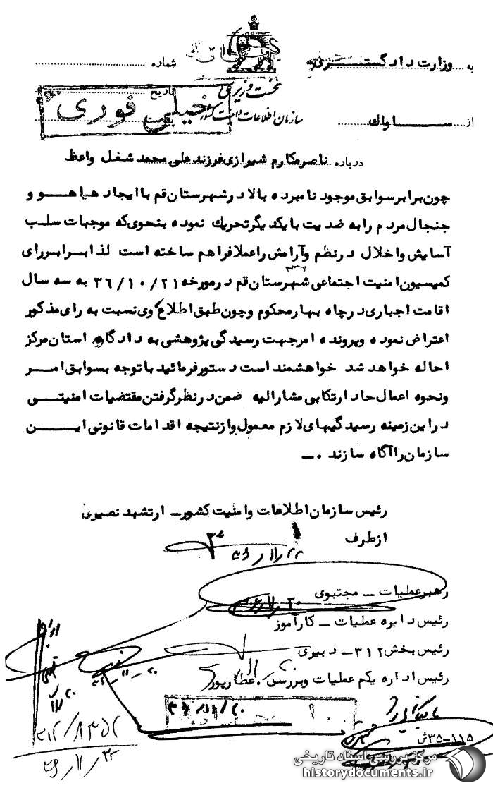 چون برابر سوابق موجود نامبرده بالا در شهرستان قم با ایجاد هیاهو و جنجال مردم را به ضدیت با یکدیگر تحریک نموده به نحوی که موجبات سلب آسایش و اخلال در نظم و آرامش را عملاً فراهم ساخته است لذا برابر رأی کمیسیون امنیت اجتماعی شهرستان قم در مورخه 21 /10 /36 به سه سال اقامت اجباری در چاهبهار محکوم و چون طبق اطلاع، وی نسبت به رأی مذکور اعتراض نموده و پرونده امر جهت رسیدگی پژوهشی به دادگاه استان مرکز احاله خواهد شد خواهشمند است دستور فرمایید با توجه به سوابق امر و نحوه اعمال حاد ارتکابی مشارالیه ضمن در نظر گرفتن مقتضیات امنیتی در این زمینه رسیدگیهای لازم معمول و از نتیجه اقدامات قانونی این سازمان را آگاه سازند.1