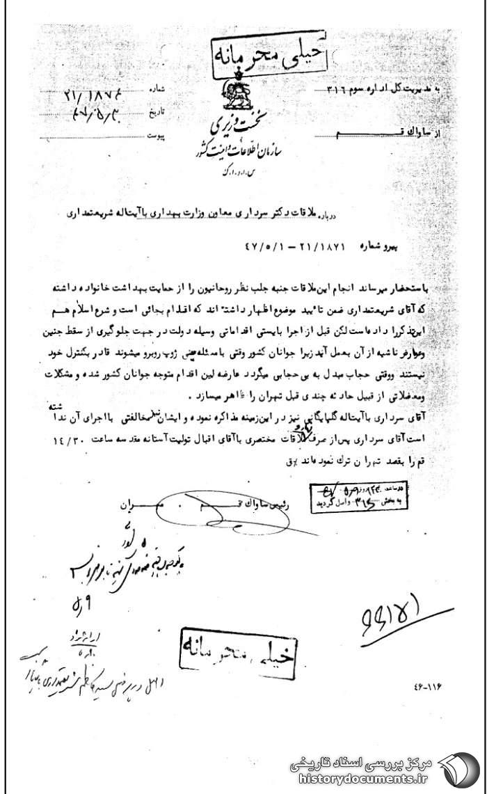 درباره : ملاقات دکتر سرداری معاون وزارت بهداری با آیت اله شریعتمداری پیرو شماره 1871/21 ـ 1/5/47