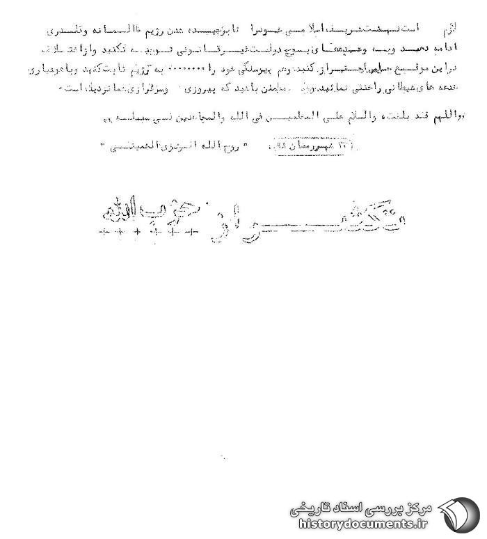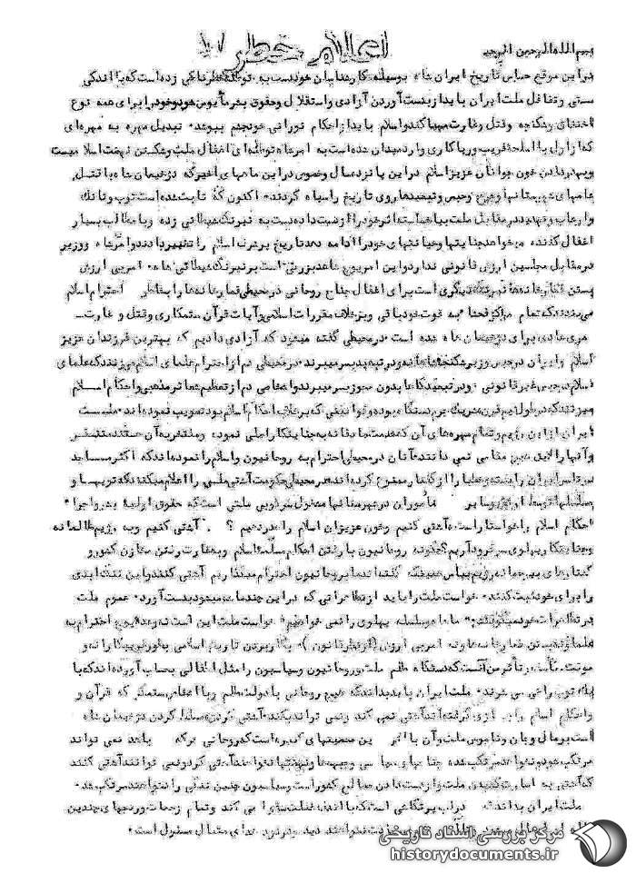 چگونه روحانیون با رفتن احکام مسلمه اسلام و به غارت رفتن مخازن کشور و کشتارهای بیرحمانه رژیم به پاس همینکه گفتهاند ما بر روحانیون احترام میگذاریم آشتی کنند و این ننگ ابدی را برای خود ثبت کنند خواست ملت را باید از تظاهراتی که در این چند ماهه میشود به دست آورد. عموم ملت در تظاهرات خود میگویند: " ما شاه و سلسله پهلوی را نمیخواهیم " خواست ملت این است نه وعده پوچ احترام به علما و بستن قمارخانهها و نه امر بیارزش (از نظر قانونی) بهکار بردن تاریخ اسلامی به طور فریبکارانه و موقتی تأسف و تأثر من آن است که دستگاه ظلم، ملت و روحانیون و سیاسیون را مثل اطفالی به حساب آوردهاند که با یک توپ راضی میشوند. ملت ایران باید بداند که هیچ روحانی با دولت ظلم و با اشخاص ستمگر که قرآن و احکام اسلام را به بازی گرفتهاند آشتی نمیکند و نمیتواند بکند. آشتی کردن مسلط کردن دژخیمان شاه است بر مال و جان و ناموس ملت و آن از بالاترین معصیتهای کبیره است که روحانی هر که باشد نمیتواند مرتکب شود و نخواهد مرتکب شد، جناحهای سیاسی و جبههها و نهضتها نخواهند آشتی کرد و نمیتوانند آشتی کنند که آشتی به اسارت کشیدن ملت و از دست دادن مصالح کشور است و سیاسیون چنین ننگی را نخواهند مرتکب شد . ملت ایران بداند که در لب پرتگاهی است که با اندک غفلت سقوط میکند و تمام زحمات و رنجهای چندین ساله او پایمال میشود و تا آخر روی سعادت نخواهد دید و در نزد خدای متعال مسئول است. لازم است نهضت شریف اسلامی خود را تا برچیده شدن رژیم ظالمانه و قلدری ادامه دهید و به وعدههای پوچ دولت غیرقانونی توجه نکنید و از اختلاف در این موقع حساس احتراز کنید و هم پیوستگی خود را ....2 به رژیم ثابت کنید و با هوشیاری خدعههای شیطانی را خنثی نمائید و مطمئن باشید که پیروزی و سرافرازی شما نزدیک است.