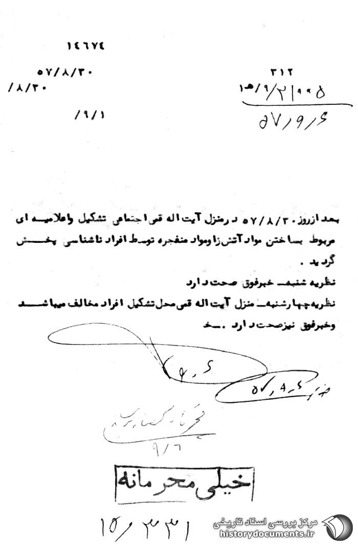 بعداز[ظهر]روز 30 /8 /57 در منزل آیتالله قمی اجتماعی تشکیل و اعلامیهای مربوط به ساختن مواد آتشزا و مواد منفجره توسط افراد ناشناسی پخش گردید.