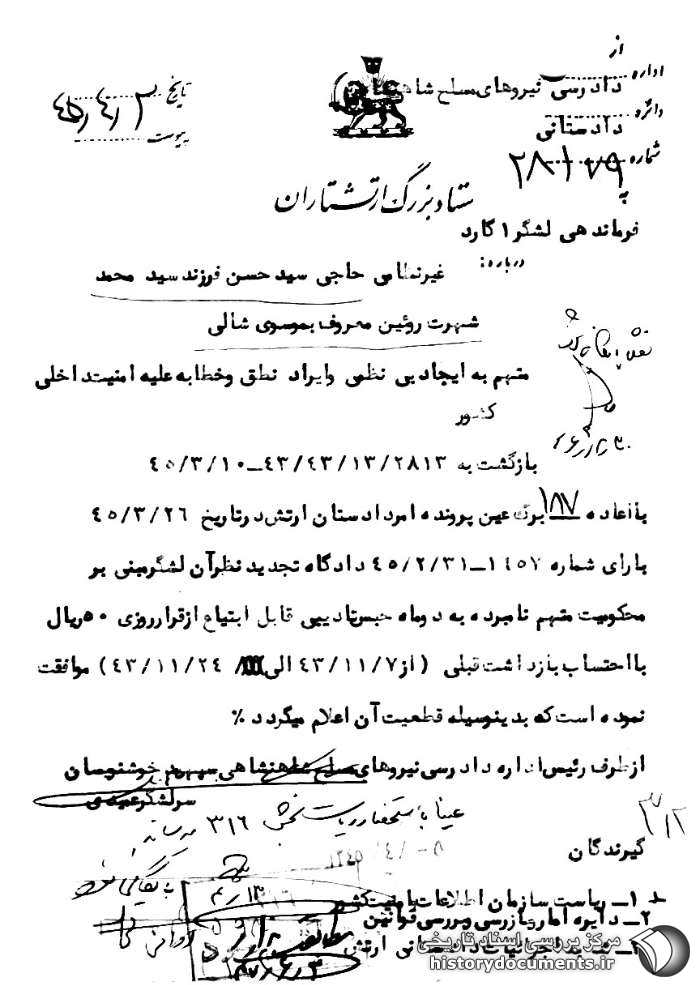از طرف رئیس اداره دادرسی نیروهای مسلح شاهنشاهی سپهبد خوشنویسان