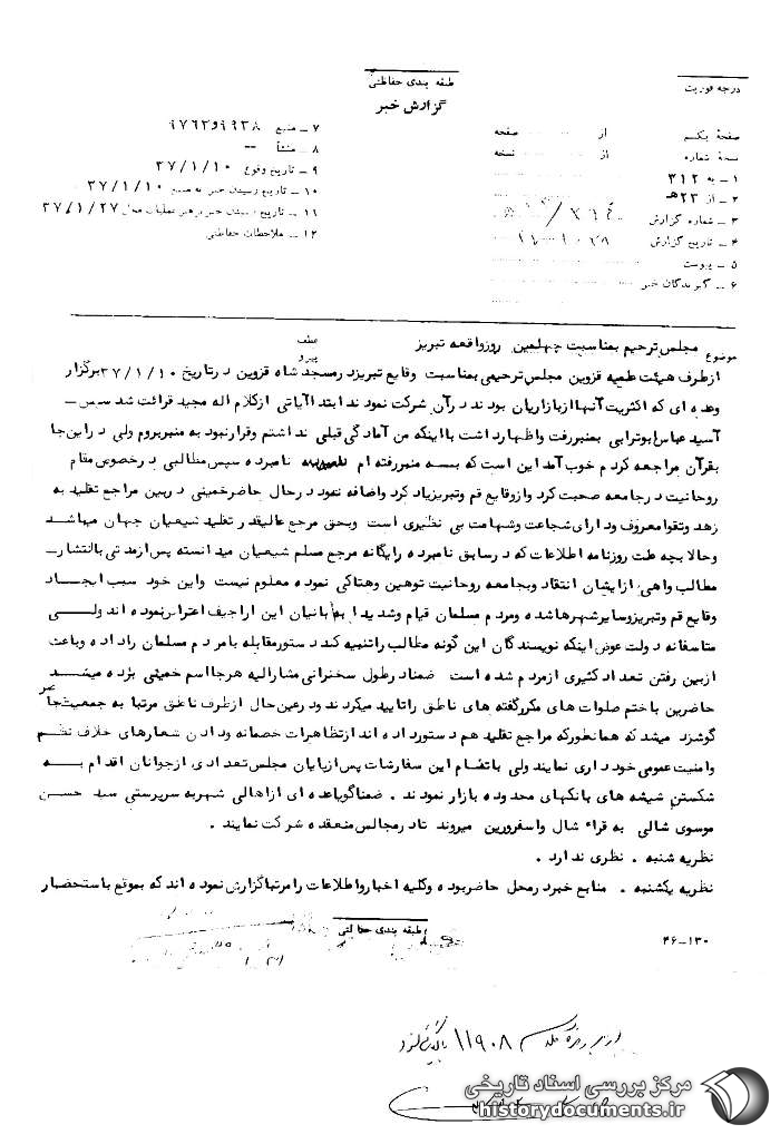 از طرف هیئت علمیه قزوین مجلس ترحیمی به مناسبت وقایع تبریز در مسجد شاه قزوین در تاریخ ۱۰ / ۱ / ۳۷ برگزار و عدهای که اکثریت آنها از بازاریان بودند در آن شرکت نمودند ابتدا آیاتی از کلامالله مجید قرائت شد سپس آسیدعباس ابوترابی به منبر رفت و اظهار داشت با اینکه من آمادگی قبلی نداشتم و قرار نبود به منبر بروم ولی در اینجا به قرآن مراجعه کردم خوب آمد این است که به منبر رفتهام نامبرده سپس مطالبی در خصوص مقام روحانیت در جامعه صحبت کرد و از وقایع قم و تبریز یاد کرد و اضافه نمود در حال حاضر خمینی در بین مراجع تقلید به زهد و تقوا معروف و دارای شجاعت و شهامت بی نظیری است و به حق مرجع عالیقدر تقلید شیعیان جهان میباشد و حالا به چه علت روزنامه اطلاعات که در سابق نامبرده را یگانه مرجع مسلم شیعیان میدانسته پس از مدتی به انتشار مطالب واهی از ایشان انتقاد و به جامعه روحانیت توهین و هتاکی نموده معلوم نیست و این خود سبب ایجاد وقایع قم و تبریز و سایر شهرها شده و مردم مسلمان قیام و شدیداً به بانیان این اراجیف اعتراض نمودهاند ولی متاسفانه دولت عوض اینکه نویسندگان این گونه مطالب را تنبیه کند دستور مقابله با مردم مسلمان را داده و باعث از بین رفتن تعداد کثیری از مردم شده است. ضمناً در طول سخنرانی مشارالیه هر جا اسم خمینی برده میشد حاضرین با ختم صلواتهای مکرر گفتههای ناطق را تایید میکردند و در عین حال از طرف ناطق مرتبا به جمعیت حاضر گوشزد میشد که همانطور که مراجع تقلید هم دستور دادهاند از تظاهرات خصمانه و دادن شعارهای خلاف نظم و امنیت عمومی خودداری نمایند ولی با تمام این سفارشات پس از پایان مجلس تعدادی از جوانان اقدام به شکستن شیشههای بانکهای محدوده بازار نمودند ضمناً گویا عدهای از اهالی شهر به سرپرستی سیدحسن موسوی شالی به قراء شال و اسفرورین میروند تا در مجالس منعقده شرکت نمایند.