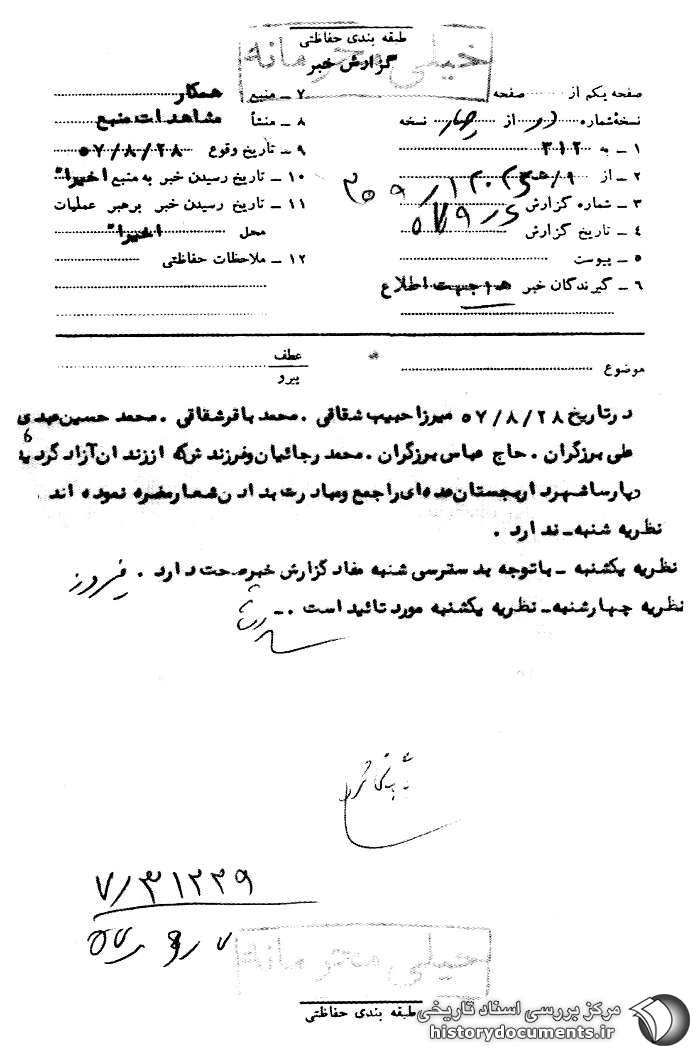 در تاریخ 28 /8 /57 میرزا حبیب شقاقی . محمدباقر شقاقی . محمدحسین عبدی . علی برزگران . حاج عباس برزگران. محمد رجائیان و فرزندش که از زندان آزاد گردیده و پارسا شهردار بجستان1 عدهای را جمع و مبادرت به دادن شعار مضره نمودهاند.
