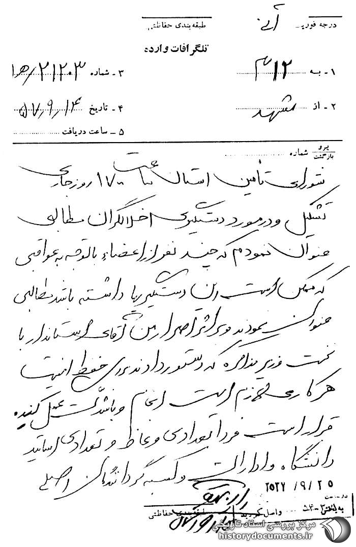 شورای تأمین استان ساعت 1700 روز جاری تشکیل و در مورد دستگیری اخلالگران مطالبی عنوان نمودم که چند نفر از اعضاء با توجه به عواقبی که ممکن است این دستگیریها داشته باشد مطالبی عنوان نمودند و بر اثر اصرار من، آقای استاندار با نخستوزیر مذاکره که دستور دادند برای حفظ امنیت هر کاری لازم است انجام و با شدت، عمل کنید. قرار است فردا تعدادی وعاظ و تعدادی اساتید دانشگاه و ادارات و کسبه گردانندگان اصلی تظاهرات مشهد دستگیر گردند.