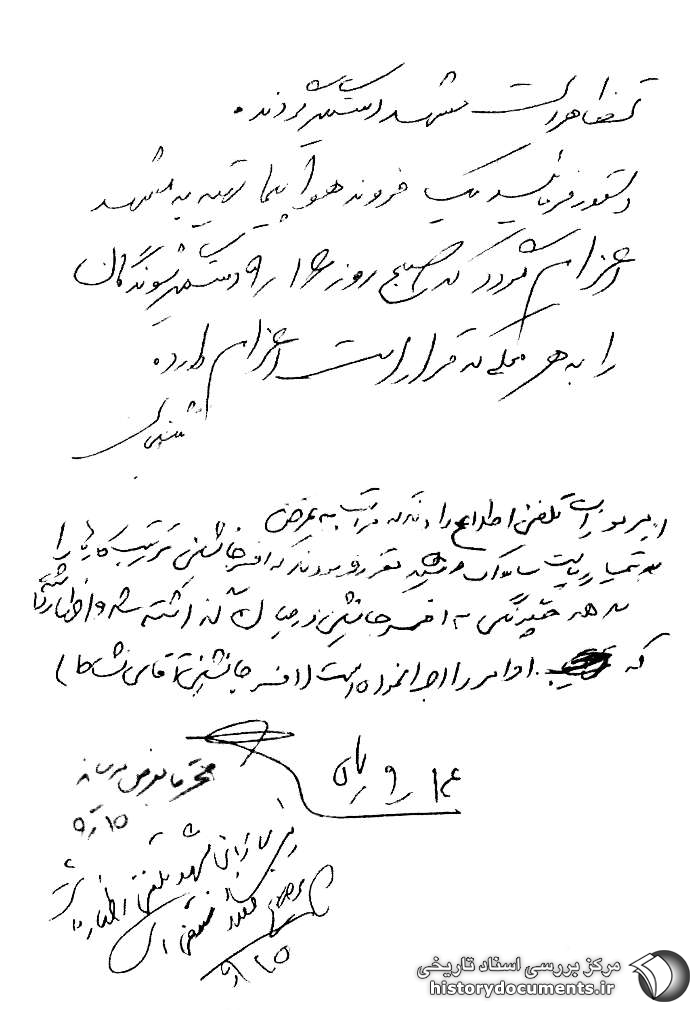 دستور فرمائید یک فروند هواپیما تهیه به مشهد اعزام گردد که صبح روز 16 /9 دستگیرشدگان را به هر محلی که قرار است اعزام دارد.