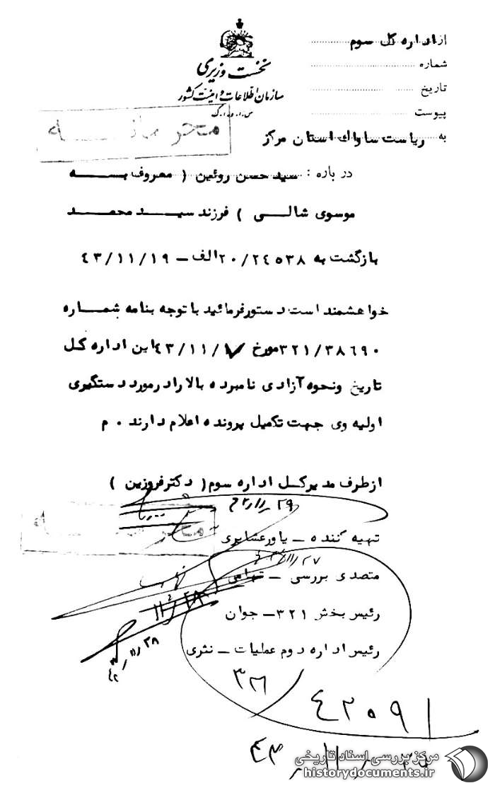 خواهشمند است دستور فرمایید با توجه به نامه شماره 38690 / 321 مورخ 7 / 11 / 43 این اداره کل تاریخ و نحوه آزادی نامبرده بالا را در مورد دستگیری اولیه وی جهت تکمیل پرونده اعلام دارند. م