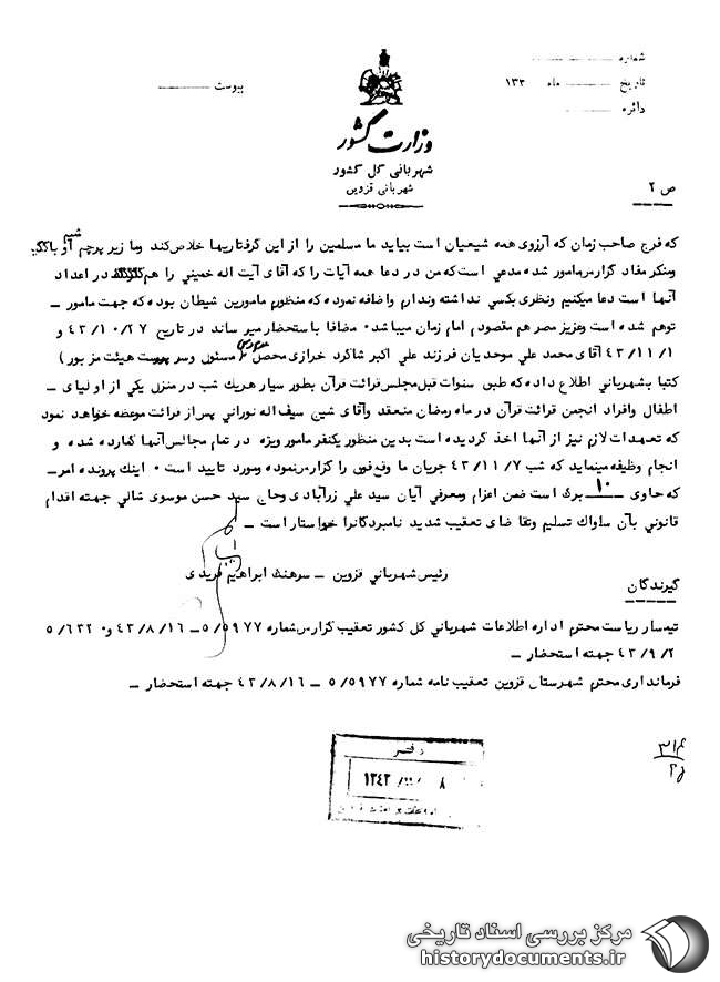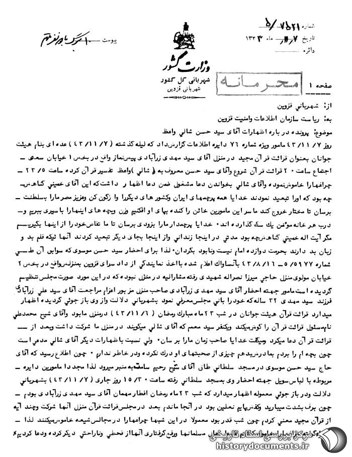 روز 7 / 11 / 43 مامور ویژه شماره 76 دایره اطلاعات گزارش داد که لیله گذشته (7 / 11 / 43) عدهای به نام هیئت جوانان به عنوان قرائت قرآن مجید در منزل آقای سید مهدی زرآبادی پیشنماز واقع در بخش 1 خیابان سعدی ـ اجتماع ساعت 20 قرائت قرآن شروع و آقای سیدحسن معروف به (شالی) واعظ تفسیر قرآن کرده ساعت 5 / 23 چراغها را خاموش نموده و آقای شالی به خواندن دعا مشغول ضمن دعا اظهار داشت که این آقای خمینی گناهش چه بودکه او را تبعید نمودند خدایا همه پرچمهای ایران و کشورهای دیگر را واژگون کن و عزیز مصر ما را به سلطنت برسان تا مختار خروج کند ما سر این مامورین خائن را کنده به پای او افکنیم و زن و بچههای اینها را به اسیری ببریم و درب هر خانه مومن یک سگ گذاردهاند. خدایا پرچمدار ما را به زودی برسان تا ما تقاص خود را از اینها بگیریم. مگر آیتاله خمینی گناهش چه بود مدتی در اینجا زندانی1 و از اینجا به جای دیگر تبعید کردند آنهایی که قلم بد و زبان بد دارند به حرمت دوازده امام نیست و نابود بگردان. لذا برای احضار سیدحسن موسوی که سوابق آن طی شماره 5977 / 5 ـ 16 / 8 / 43 به آن ساواک اعلام شده با اخذ نمایندگی از دادسرای قزوین به منزلش واقع در بخش 2 خیابان مولوی منزل حاجی میرزا نصراله شهیدی رفته مشارالیه در منزل نبوده که در این مورد صورت مجلس تنظیم گردیده است. مامور جهت احضار آقای سید مهدی زرآبادی صاحب منزل مزبور اعزام مراجعت آقای سیدعلی زرآبادی فرزند سید مهدی 32 ساله که خود را بانی مجلس معرفی نمود به شهربانی دلالت و از وی بازجویی گردیده اظهار میدارد قرائت قرآن هیئت جوانان در شب 23 ماه مبارک رمضان (6 / 11 / 43) درمنزل ما بود و آقای شیخ محمدعلی نام مسئول قرائت قرآن را گوش میکند و یک نفر سید معمم که آقای شالی میگویند در منزل ما شرکت داشت و بعد از قرائت قرآن دعا میکرد و میگفت خدایا صاحب زمان ما را برسان. ولی نسبت به اظهارات دیگر آقای شالی مدعی است چون بچهام را بردم به مادرش بدهم چیزی از صحبتهای او درک نکرده و در خاطر ندارم. چون اطلاع رسید که آقای حاج سیدحسن موسوی در مسجد سلطانی2 طاق آقای شیخ رحیم سامت به منبر میرود لذا مجدداً مامورین دایره مربوط به لباس سویل جهت احضار وی به مسجد سلطانی رفته ساعت 30 / 15 روز جاری (7 / 11 / 43) به شهربانی دلالت و در بازجویی معموله اظهار میدارد که شب 23 ماه رمضان افطار مهمان آقای سید مهدی زرآبادی بودم چون برف به شدت میبارید و کفش پایم نعلین بود در آنجا ماندم بعد در مجلس قرائت قرآن منزل آنها شرکت و چند آیه از قرآن مجید معنی کردم چون شب قدر بود معمولاً در این شبها چراغها را خاموش میکنند لذا احیاء گرفته چراغها را خاموش کردیم و دعا به حال مسلمانها و رفع گرفتاری آنها از قحطی و ناراحتی دیگر کرده و دعا کردیم که فرج صاحب زمان که آرزوی همه شیعیان است بیاید ما مسلمین را از این گرفتاریها خلاص کند و ما زیر پرچم او باشیم و منکر مفاد گزارش مامور شده مدعی است که من در دعا همه آیات را که آقای آیتاله خمینی را هم در عداد آنها است دعا میکنم و نظری به کسی نداشته و ندارم و اضافه نمود که منظورم مامورین شیطان بوده که جهت مامور توهم شده است و عزیز مصر هم مقصودم امام زمان میباشد.