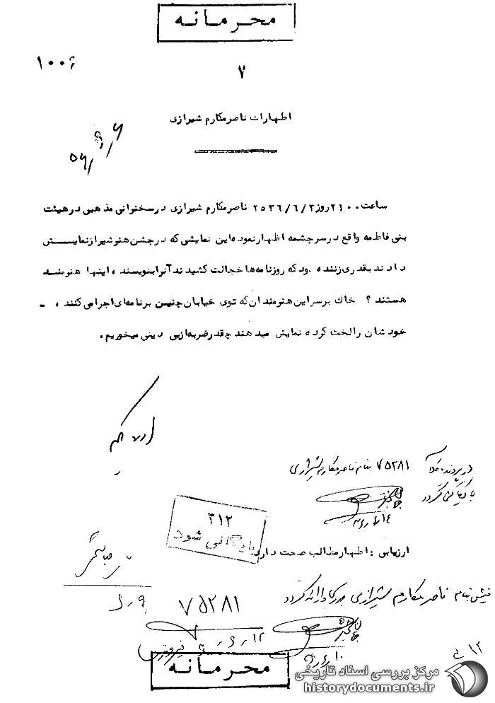 ساعت 2100 روز 3 /6 /2536 ناصر مکارم شیرازی در سخنرانی مذهبی در هیئت بنیفاطمه واقع در سرچشمه اظهار نموده این نمایشی که در جشن هنر شیراز نمایش دادند، به قدری زننده بود که روزنامهها خجالت کشیدند آن را بنویسند. اینها هنرمند هستند؟ خاک بر سر این هنرمندان که توی خیابان چنین برنامهای اجرا میکنند، خودشان را لخت کرده نمایش میدهند چقدر ضربه از بیدینی میخوریم.1