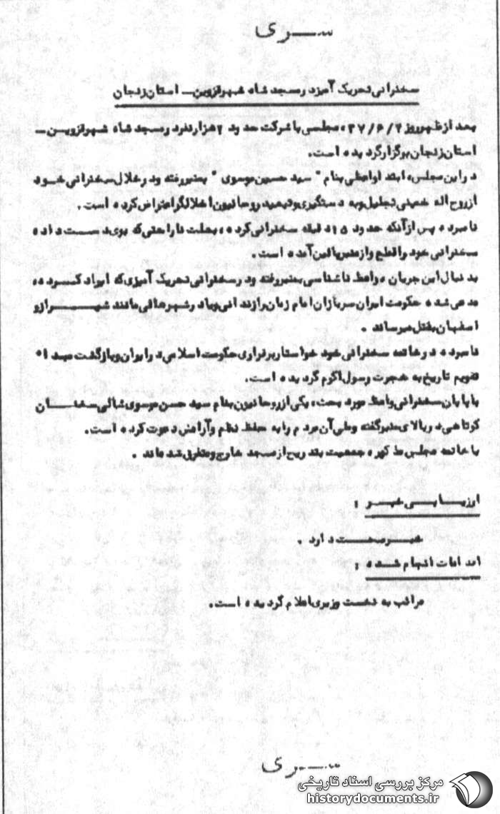 بعدازظهر روز 4 / 6 / 37، مجلسى با شرکت حدود 2 هزار نفر در مسجد شاه شهر قزوین استان زنجان، برگزار گردیده است.