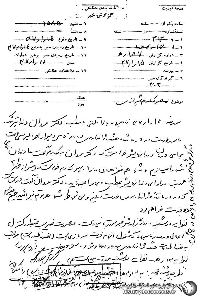 مورخه 14 /1 /37 نامبرده بالا تلفنی با مطب دکتر مروان دندانپزشک مأمور خدمت در درمانگاه هنگ ژاندارمری مهاباد تماس و پس از احوالپرسی وقت برای درمان دندانهایش خواست که دکتر مروان به مکارم گفت ما دندانهای شما را میسازیم و شما هم مغزهای ما را. سپس مکارم خواست که پیشازظهرها جهت مداوای دندانهایش به مطب وی مراجعه نماید. دکتر مروان گفت درست است که در درمانگاه ژاندامری خدمت میکنم ولی به خاطر شما هر موقع بفرمایید جیم میشوم و در خدمت خواهم بود.