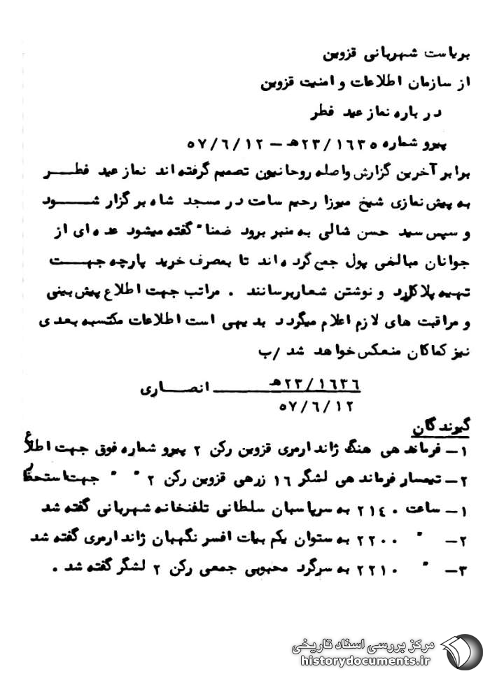 برابر آخرین گزارش واصله روحانیون تصمیم گرفتهاند نماز عید فطر به پیشنمازی شیخ میرزا رحیم سامت در مسجد شاه برگزار شود و سپس سیدحسن شالی به منبر برود ضمناً گفته میشود عدهای از جوانان مبالغی پول جمع کردهاند تا به مصرف خرید پارچه جهت تهیه پلاکارد و نوشتن شعار برسانند. مراتب جهت اطلاع پیشبینی و مراقبتهای لازم اعلام میگردد بدیهی است اطلاعات مکتسبه بعدی نیز کماکان منعکس خواهد شد. / ب