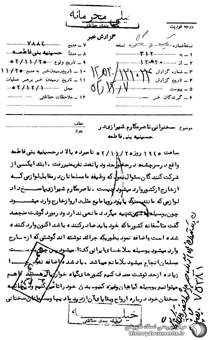 ساعت 1945 روز 25 /11 /50 نامبرده بالا در حسینیه بنیفاطمه واقع در سرچشمه در حضور حدود پانصد نفر به منبر رفت. ابتدا یکی از شرکتکنندگان سئوال نمود که وظیفه ما مسلمانان در مقابل لوازمی که از خارج از کشور وارد میشود چیست؟ ناصر مکارم شیرازی پاسخ داد لوازمی که مانند سنگ یا پودر و یا مایع مثل دارو از خارج وارد میشود چون به وسیله ماشین تهیه میگردد مانعی ندارد و در مورد گوشت منجمد گفت متأسفانه کشور ما که خود باید صادرکننده باشد اکنون واردکننده شده است و اضافه نمود به طوری که جراید نوشتهاند گوشتی که از خارج وارد میشود به وسیله سلاخهای ایرانی کشتار میشود پس چون به دست مسلمان انجام میشود بلامانع میباشد. یادشده اضافه نمود چرا زیاده از حد گوشت مصرف کنیم کشورهای گیاه خوار زیاد هستند ما هم میتوانیم به وسیله گیاهان و غیره کمبود بدن خود را تأمین کنیم و در خاتمه سخنان خود درباره ارواح و بقایای آن از دید مادیها و مسلمانان سخنانی عنوان نمود و جلسه در ساعت 2045 خاتمه یافت.