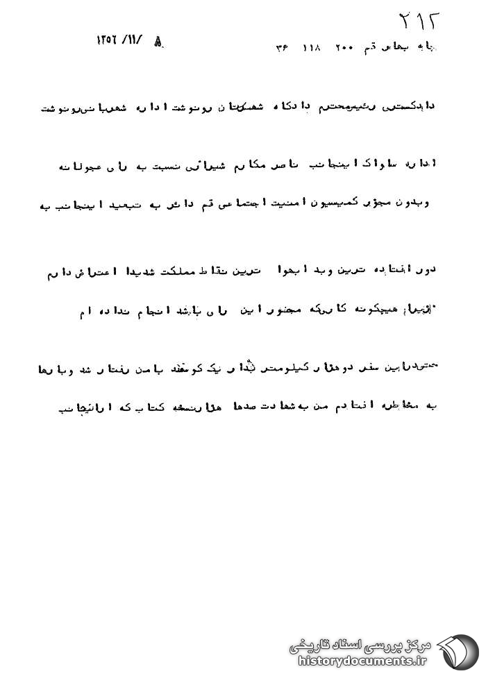 1. ساواک قم این تلگراف را طی شماره 5814 /21 - 9 /11 /36 برای اداره کل سوم ارسال نموده است. بخش ضمائم که اداره کل سوم طی شماره 8596 /312- 30 /11 /36 در پاسخ نوشت: «ضمن اینکه شرح لازم درباره مفاد نامه بازگشتی فوق به وزارت دادگستری نوشته شده است ترتیبی اتخاذ نمایند تا با تشکیل کمیسیون امنیت اجتماعی محل تبعید شخص مورد بحث از چاهبهار به کرمان تغییر داده شود و نتیجه را سریعاً اعلام دارند.» بخش ضمائم