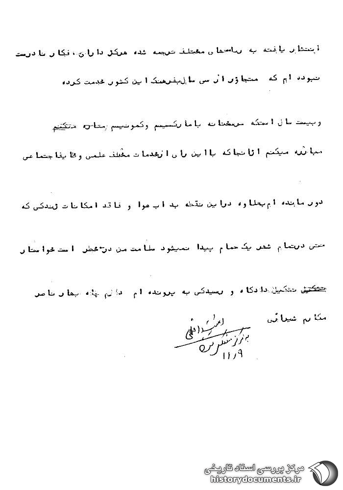 اینجانب ناصر مکارم شیرازی نسبت به رأی عجولانه و بدون مجوز کمیسیون امنیت اجتماعی قم دایر به تبعید اینجانب به دورافتادهترین و بد آب و هواترین نقاط مملکت شدیداً اعتراض دارم زیرا هیچگونه کاری که مجوز این رأی باشد انجام ندادهام. حتی در این سفر دو هزار کیلومتری بدتر از یک گوسفند با من رفتار شد و بارها به مخاطره افتادم. من به شهادت صدها هزار نسخه کتاب[که] از اینجانب انتشاریافته [و] به زبانهای مختلف ترجمه شده هرگز دارای افکار نادرست نبودهام که متجاوز از سی سال به فرهنگ این کشور خدمت کردهام و بیست سال است که سرسختانه با مارکسیسم و کمونیسم مبارزه میکنم از آنجا که با این رأی از خدمات مختلف علمی [و] وظایف اجتماعی دور ماندهام بعلاوه در این منطقه بد آب و هوا و فاقد امکانات زندگی که حتی در تمام شهر یک حمام پیدا نمیشود سلامت من در خطر است خواستار تشکیل دادگاه و رسیدگی به پروندهام [را] دارم.1