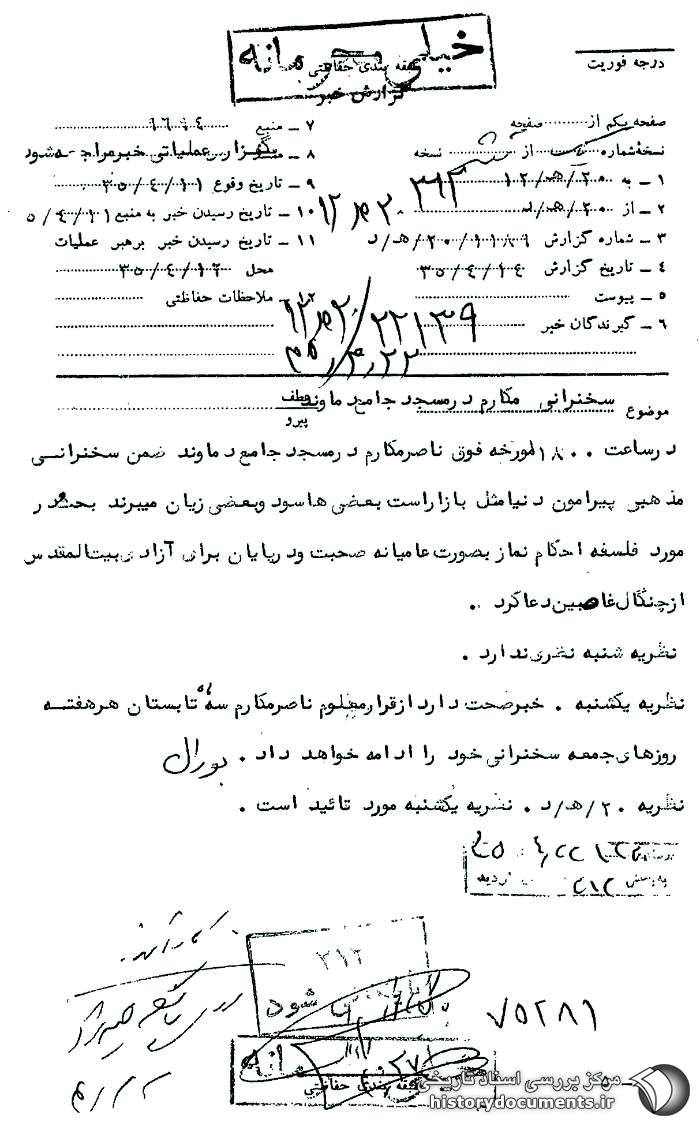 در ساعت 1800 مورخه فوق [11 /4 /35] ناصر مکارم در مسجد جامع دماوند ضمن سخنرانی مذهبی پیرامون دنیا مثل بازار است بعضیها سود و بعضی زیان میبرند بحث و در مورد فلسفه احکام نماز به صورت عامیانه صحبت و در پایان برای آزادی بیتالمقدس از چنگال غاصبین دعا کرد.
