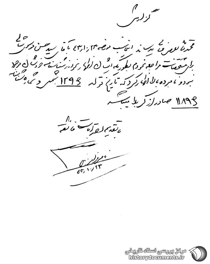 محترماً به عرض عالی میرساند اینجانب مورخه 23 / 10 / 43 به آقای سیدحسن موسوی شالی برای مشخصات مراجعه نمودم به طوری که ایشان اظهار نمودند شناسنامه خودشان موجود نبوده و نامبرده بالا اظهار کرد که تاریخ تولد 1296 شمسی و شماره شناسنامه 11896 صادره از کربلا میباشد.