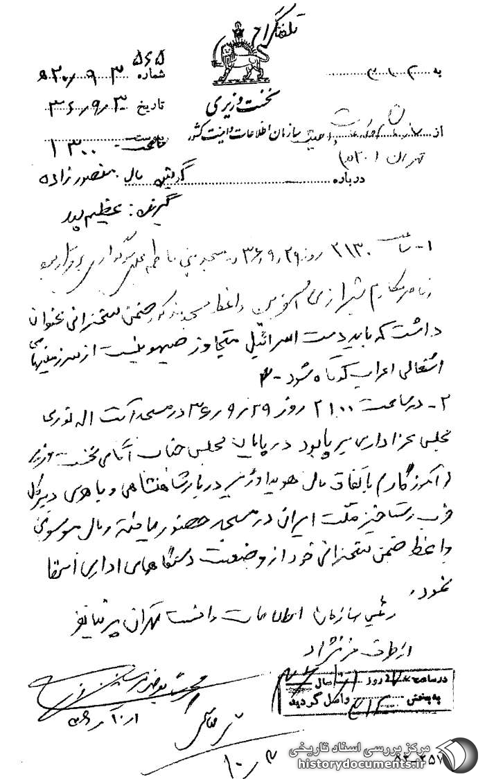 2. در ساعت 2100 روز 29 /9 /36 در مسجد آیتاله نوری مجلس عزاداری برپا بود. در پایان مجلس جناب آقای نخستوزیر (آموزگار1) به اتفاق آقای هویدا وزیر دربار شاهنشاهی و باهری2 دبیرکل حزب رستاخیز ملت ایران در مسجد حضور یافته و آقای موسوی واعظ ضمن سخنرانی خود از وضعیت دستگاههای اداری انتقاد نمود.