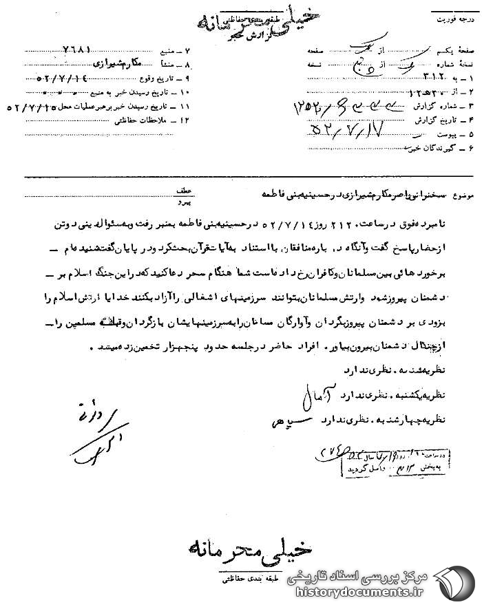 نامبرده فوق در ساعت 2120 روز 14 /7 /52 در حسینیه بنیفاطمه به منبر رفت و به سؤال دینی دو تن از حضار پاسخ گفت و آنگاه درباره منافقان با استناد به آیات قرآن بحث کرد و در پایان گفت شنیدهام برخوردهایی بین مسلمانان و کافران رخ داده است، شما هنگام سحر دعا کنید که در این جنگ، اسلام بر دشمنان پیروز شود و ارتش مسلمانان بتوانند سرزمینهای اشغالی را آزاد بکنند.1 خدایا ارتش اسلام را به زودی بر دشمنان پیروز بگردان و آوارگان مسلمان را به سرزمینهایشان بازگردان و قبله مسلمین را از چنگال دشمنان بیرون بیاور. افراد حاضر در جلسه حدود پنج هزار نفر تخمین زده میشد.