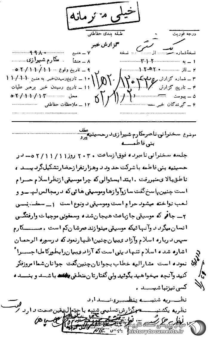 جلسه سخنرانی نامبرده فوق از ساعت 2030 روز 11 /11 /52 در حسینیه بنیفاطمه با شرکت حدود دو هزار نفر تشکیل گردید، ناطق بالای منبر رفت. ابتدا به سؤالی که چرا موسیقی از نظر اسلام حرام است چنین پاسخ گفت. ساز و آوازها و موسیقیهایی که در مجالس لهو و لعب نواخته میشود حرام است و موسیقی دو نوع است: 1. سمفونی. 2. جاز که موسیقی جاز باعث هیجان شده و سمفونی موجبات وارفتگی انسان میگردد و آنهایی که موسیقی مینوازند عمرشان کم است. مکارم سپس درباره اسلام و آزادی بیان، چنین اظهار نمود که در سوره الرحمان اشاره شده اسلام تنها دینی است که آزادی بیان را به طور کامل اجرا نموده است. مشارالیه خطاب به جوانان چنین گفت جوانان شما امروز فکر کنید و آنچه میخواهید بگویید ولی گفتارتان منطقی باشد و بنده کسی نیز نباشید.1