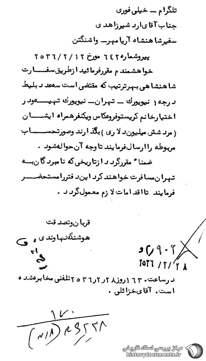 پیرو شماره 642 مورخ 12 /2 /2536خواهشمندم مقرر فرمائید از طریق سفارت شاهنشاهی به هر ترتیب که مقتضی است سه عدد بلیط درجه 1 نیویورک ـ تهران ـ نیویورک تهیه و در اختیار خانم کریستوفر و عکاس و یکنفر همراه ایشان (مرد شش میلیون دلاری) بگذارند و صورتحساب مربوطه را ارسال فرمایند تا وجه آن حواله شود.