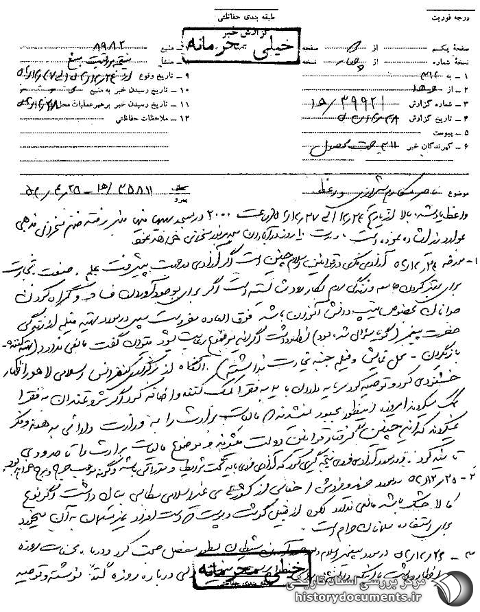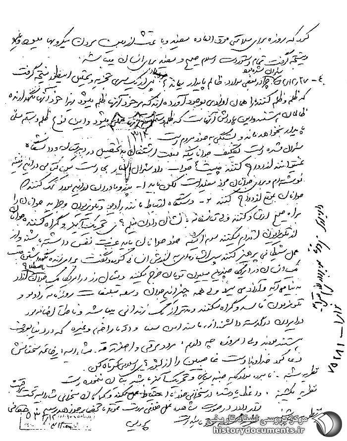 3. 26 /12 /52 در مورد پیغمبر اسلام و بوجود آمدن شیطان به طور مفصل صحبت کرد و درباره محسنات روزه اظهار داشت با این که دانشمند روسی[ناخوانا] ولی درباره روزه کتباً نوشته و توصیه کرد که روزه برای سلامتی فوقالعاده مفید و باعث از بین بردن میکروبها میشود و غیره و نتیجه گرفت تمام دستورات اسلام صحیح و مفید برای انسان میباشد.