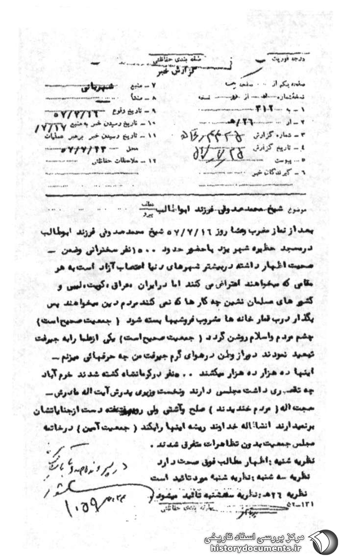 بعد از نماز مغرب و عشا روز ۱۶/۷/۵۷ شیخ محمد صدوقی فرزند ابوطالب در مسجد حظیره شهر یزد با حضور حدود ۱۵۰۰ نفر سخنرانی و ضمن صحبت اظهار داشته: در بیشتر شهرهای دنیا اعتصاب آزاد است به هر مقامی که میخواهند اعتراض میکنند. اما در ایران، عراق، کویت، لیبی و کشورهای مسلمان نشین چکارها که نمیکنند؟ مردم دین میخواهند پس بگذار درب قمارخانهها، مشروب فروشیها بسته شود. (جمعیت: صحیح است) چشم مردم و اسلام روشن گردد (جمعیت صحیح است) یکی از علما را به جیرفت تبعید نمودند. دور از وطن در هوای گرم جیرفت من چه حرفهایی میزنم! اینها ده هزار ده هزار میکشند ۵۰۰ نفر در کرمانشاه کشته شدند. خرم آباد چه تقصیری داشت؟ مجلسی دارند و نخست وزیری [که] (پدرش۱ آیتالله مادرش حجت الله مردم خندیدند) صلح و آشتی ولی روی هم رفته دست از جنایاتشان برنمیدارند. ان شاء الله خداوند ریشه اینها را بکند (جمعیت: امین) در خاتمه مجلس جمعیت بدون تظاهرات متفرق شدند.
