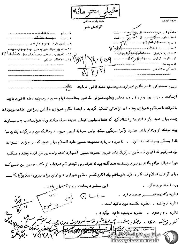 از ساعت 1600 روز 9 /11 /52 مجلس وعظ و سخنرانی مذهبی به مناسبت ایام محرم در حسینیه محله قاضی دماوند با شرکت ناصر مکارم شیرازی و عدهای از اهالی تشکیل گردید. ابتدا مکارم شیرازی مطالبی پیرامون خلقت موجودات زنده بیان نمود و از دانش بشر انتقاد کرد که هفتاد میلیون تومان هزینه صرف میکنند و یک هواپیمای ب 52 میسازند و یک موشک از ویتنام بلند میشود و آن را سرنگون میکند و این سرمایه از بین میرود در حالی که مردم در گوشه و کنار دنیا غذا و مسکن [و] بهداشت ندارند. نامبرده درباره معنویت حسین علیهالسلام بیان نمود که در جراید نوشته بودند رئیس فداییان فلسطین1 در کربلا پای ضریح حضرت حسین اظهار داشته یا حسین من ایده و عقیده و مکتب تو را دنبال میکنم و گاندی2 نیز در نهضت هند گفته بود که هر قدر من کوشش کنم نمیتوانم از مکتب حسین بن علی که برای آزادی اسلام فداکاری کرد جلو بیفتم و فداکاری کنم. مکارم شیرازی در پایان برای پیروزی اسلام و آزادی بیتالمقدس دعا کرد. این مجلس در ساعت 1700 پایان یافت.