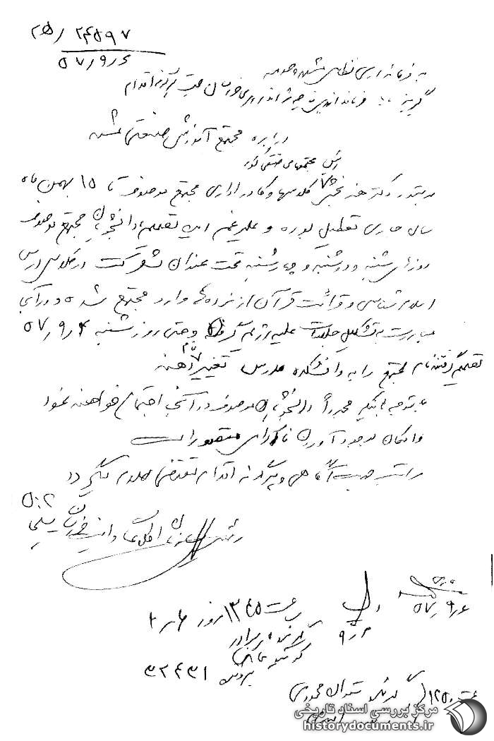 به دستور دکتر هنربخش1 رئیس مجتمعهای صنعتی کشور، کلاسها و کادر اداری مجتمع موصوف تا 15 بهمن ماه سال جاری تعطیل بوده و علیرغم این تصمیم، دانشجویان مجتمع موصوف روزهای شنبه و دوشنبه و چهارشنبه تحت عنوان شرکت در کلاس درس اسلام شناسی و قرائت قرآن از نردهها وارد مجتمع شده و در آنجا مبادرت به تشکیل جلسات علیه رژیم گرفته و حتی روز شنبه 4 /9 /57 تصمیم گرفتند نام مجتمع را به دانشکده مدرس2 تغییر نام دهند.